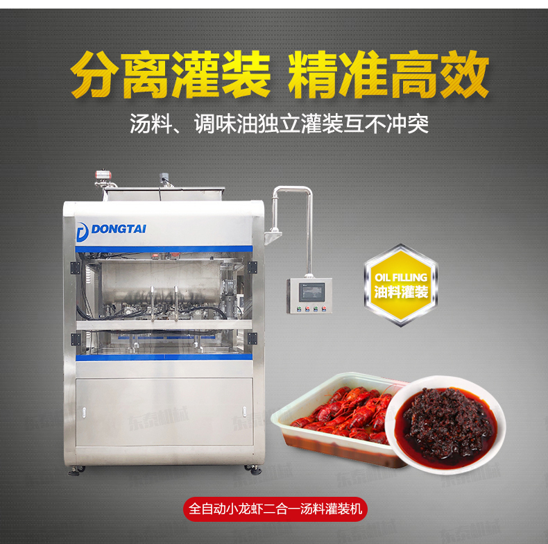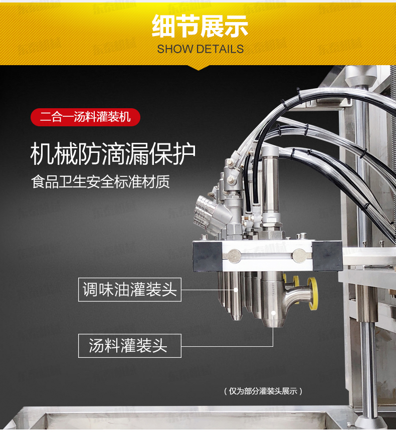 1.灌裝機(jī)在參考國外同類產(chǎn)品的基礎(chǔ)上進(jìn)行改良設(shè)計(jì),特制湯料、調(diào)味油灌裝頭,機(jī)械防滴漏保護(hù),在灌裝過程中不會污染包裝容器。