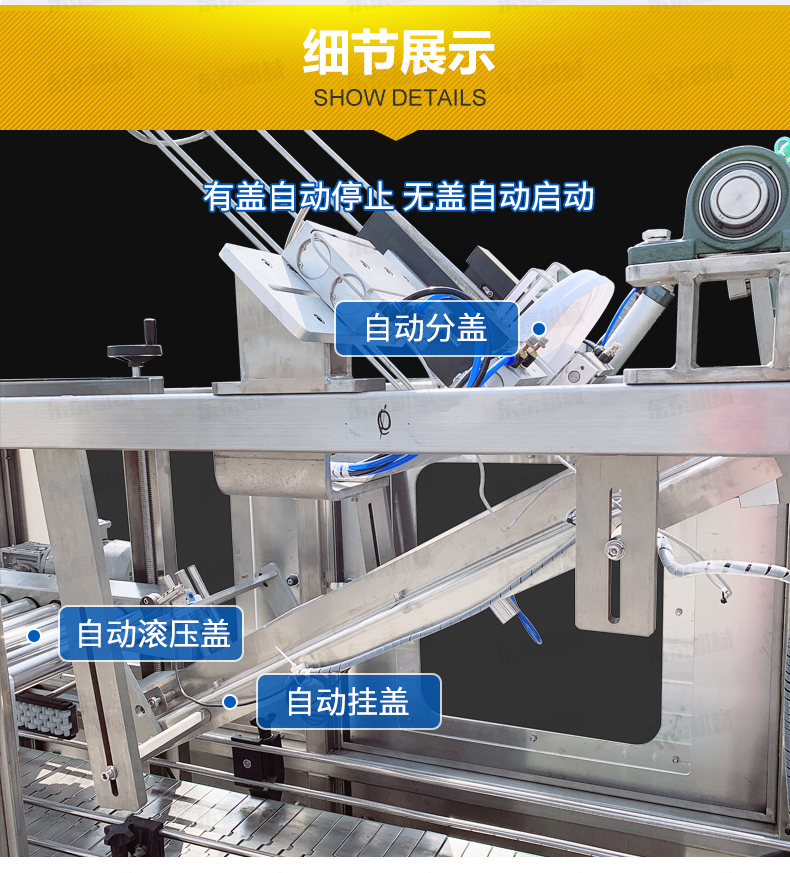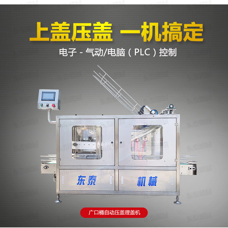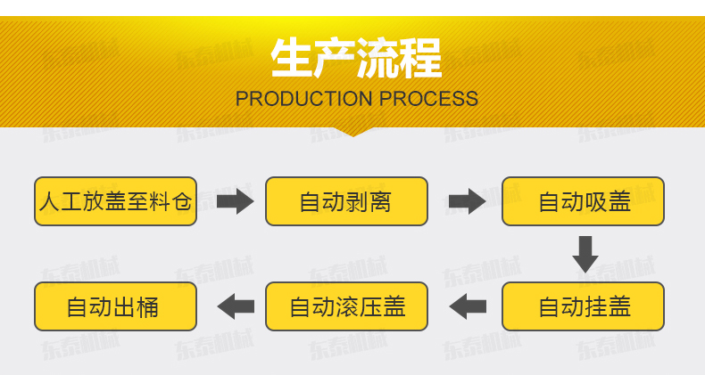 人工放蓋至料倉——自動(dòng)剝離——自動(dòng)吸蓋——自動(dòng)掛蓋——自動(dòng)滾壓蓋——自動(dòng)出桶——一個(gè)循環(huán)完成。