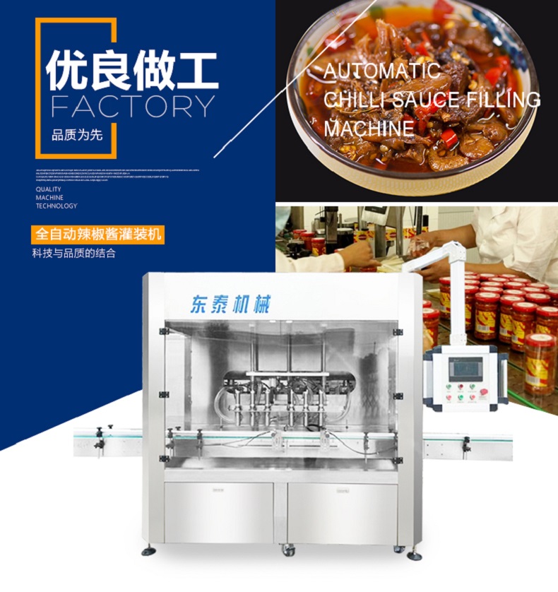 全自動辣椒醬類醬體灌裝生產(chǎn)線作為公司新研發(fā)的灌裝設備在市場上起到了關鍵性的作用,獨特的技術讓整個包裝市場變得富有生命力,是集光,機,電,氣于一體,采用活塞式定量原理,灌裝精度高,操作簡單,維護方便,設備主要材質:采用SUS304不銹鋼制造,符合衛(wèi)生要求.灌裝過程采用亞克力透明板與外界隔離,保證灌裝的衛(wèi)生要求。灌裝采用壓力式灌裝,無需配裝高位罐,簡化了安裝工序,提高了灌裝效率。可廣泛應用于食品、醬料行業(yè)產(chǎn)品的自動化包裝生產(chǎn)。幾乎能夠灌裝所有醬類、醬料物體是該款全自動辣椒醬類醬體灌裝生產(chǎn)線最大的優(yōu)勢,包括大塊肉醬、顆粒醬、濃醬、豆瓣醬、甜面醬、辣椒醬等。