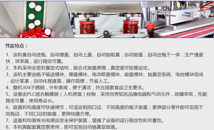 1、該機集自動進瓶、自動理蓋、自動上蓋、自動抽吸真,自動旋蓋,自動出瓶于一體,生產速度快,效率高,運行穩定可靠。
